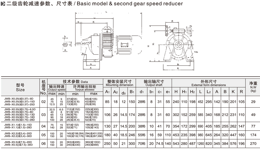 JWB-X系列無級(jí)變速機(jī)一級(jí)二級(jí)參數(shù)與尺寸表